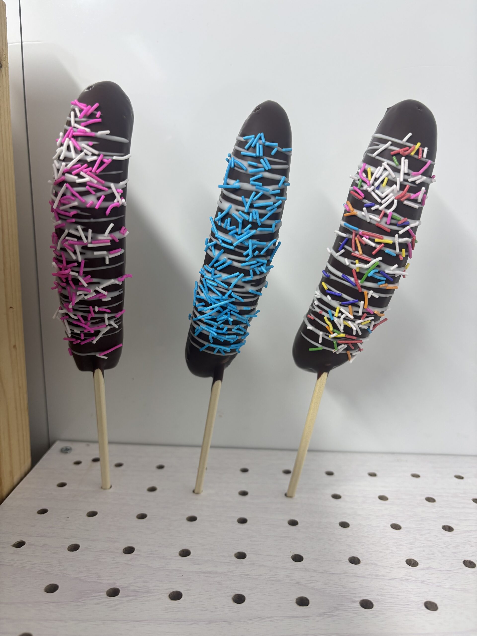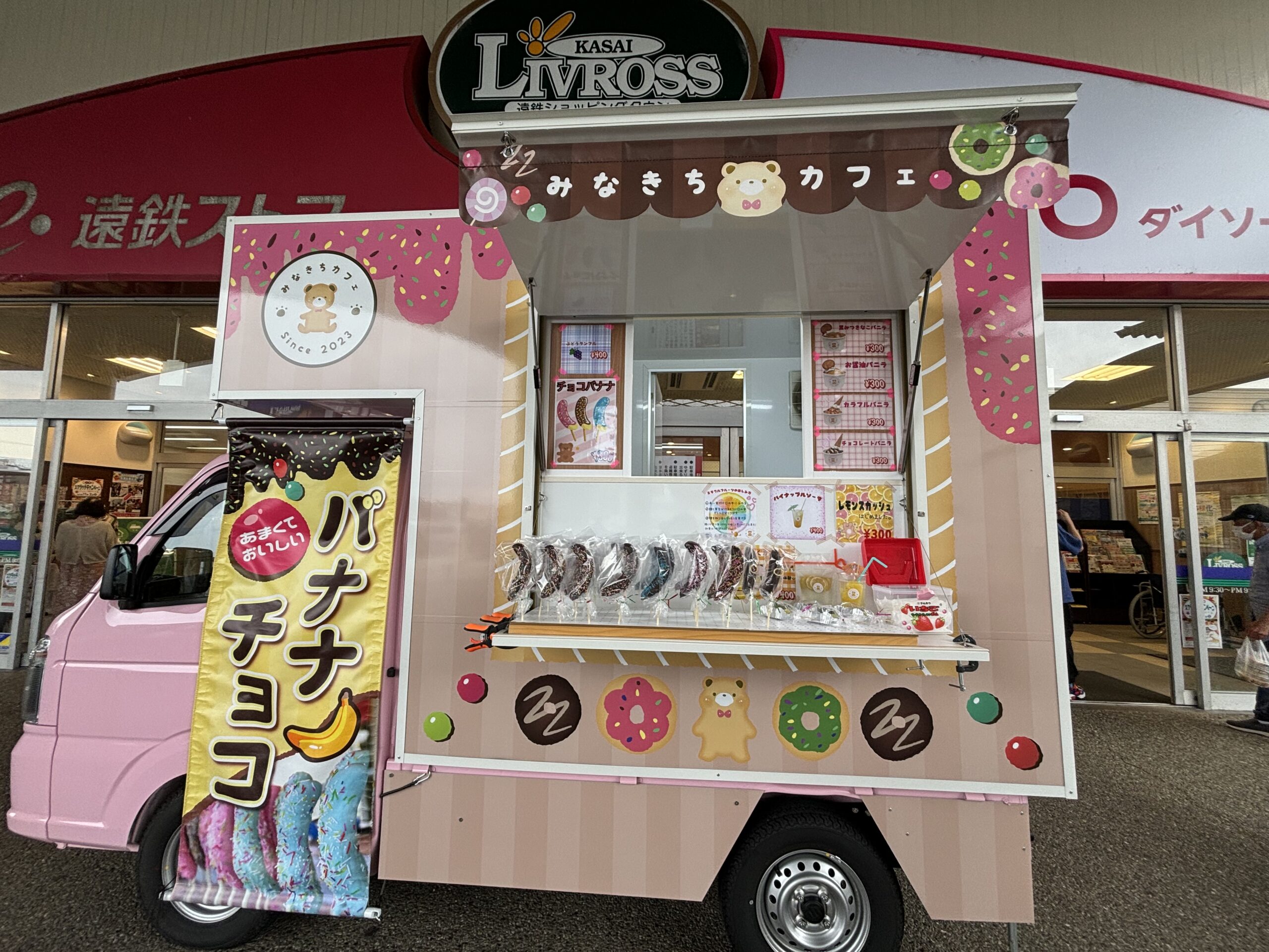 チョコバナナをメインに苺やマスカットやパイナップルなど季節のフルーツチョコ串などを販売しています。お子様に喜んでもらえる可愛い商品とお小遣いで買える低価格な設定です。